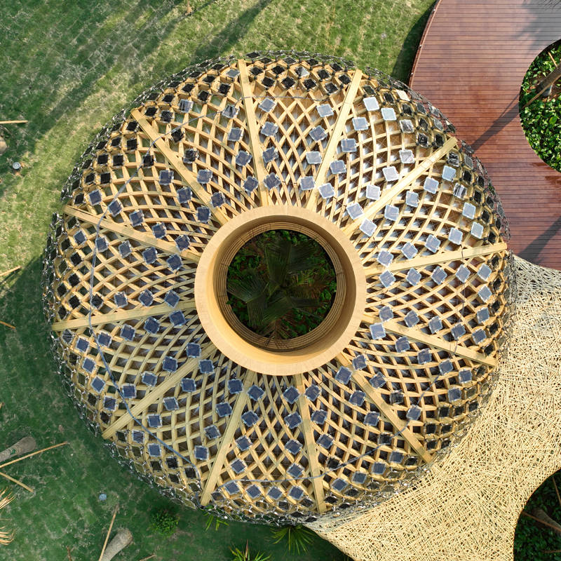 «Это похоже на что-то для вас? Бамбуковая шляпа, возможно два или три. Есть более чем 1500 фотоэлектрические панели на крыше для сбора и передачи, солнечная энергия для освещения парка. Павильон для посетителей расположен в кокосовой роще на берегу озера., был построен с высокой производительностью, экологически чистые натуральные материалы, например, бамбук, используемый для создания каркаса, снижающего потребление энергии и выбросы углекислого газа»..